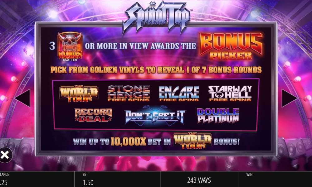 The Spinal Tap slot is incredibly rich in all sorts of bonus features, multipliers and so on. In the midst of this bonus variety there are those for which you will be given free spins.