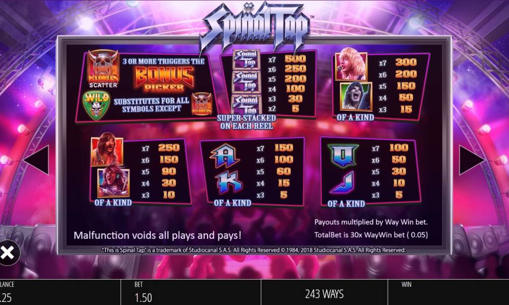 It's not just rock fans who should try out Spinal Tap in demo. It's sure to enthrall any fan of multi-functional slots.