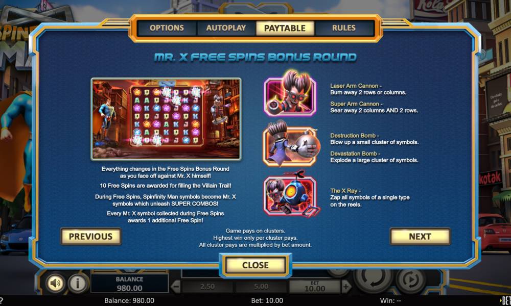 Please read about bonus options and types of symbols of the Spinfinity Man by Betsoft below in the review.
