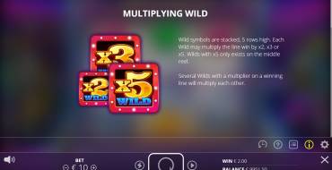 Wild symbol with additional multipliers can fall on all reels. It substitutes for any other symbols to create winning combinations and multiplies line winnings by x2, x3 or x5.