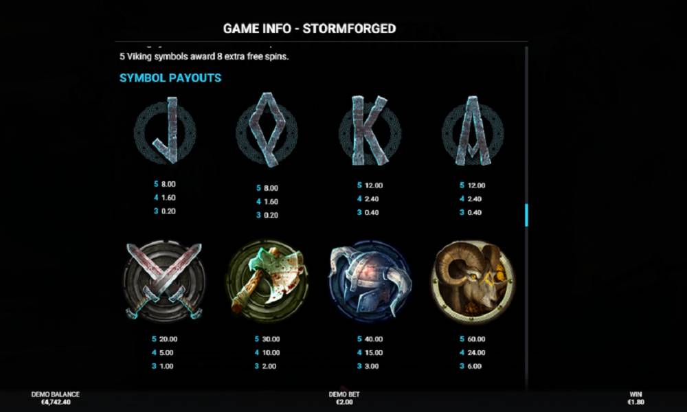 The Stormforged slot has an intuitive interface suitable for players of all levels. Before you start playing, it's worth familiarizing yourself with the rules and payout table in the information section of the menu.