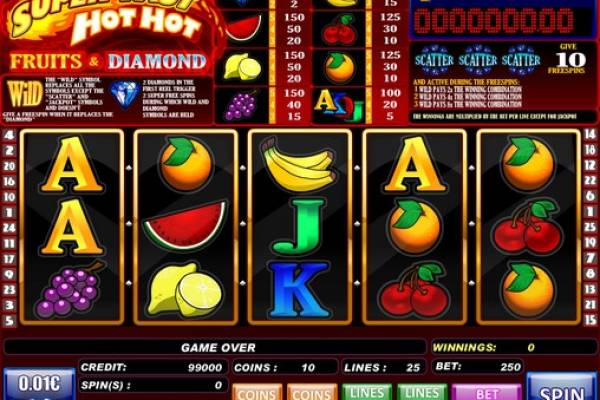 Super Fast Hot Hot is a free slot machine with five reels, twenty five paylines and three rows of icons at the screen. It provides the special symbols, additional multipliers, free spins, a progressive jackpot and other interesting functions, which you would find out about later.