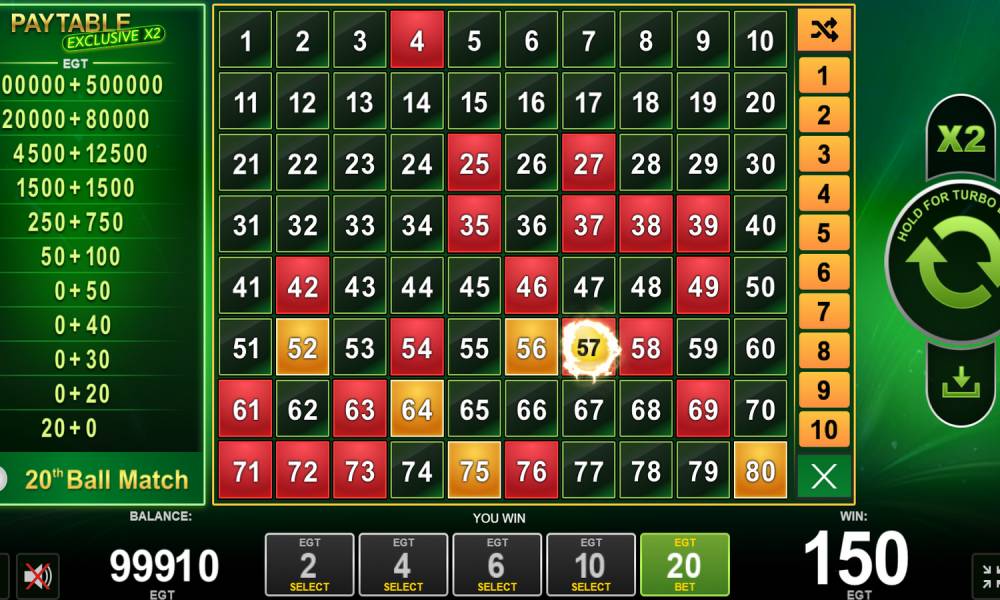 The game board is 10x8 and the cells contain numbers from 1 to 80. The player must select from 1 to 10 of any position. You can do it yourself or in the column on the right to specify the number and click on the double arrow to the machine itself marked the cells. After the bet, the user starts the spin and 20 balls fall out. If some of them coincided with the numbers that marked the player, he receives a prize. The amount of winnings is calculated on the table and depends on the bet and the number of marks made on the field. Users can play in two modes. In the first case, the betting range is 1-10 coins, in the second case - 2-20. The difference between the rounds will be that if the last dropped ball coincides with the choice of the player, then he will receive a prize according to the alternative scheme (the number after the "+" symbol in the table). And in the second case, these amounts are much larger.
