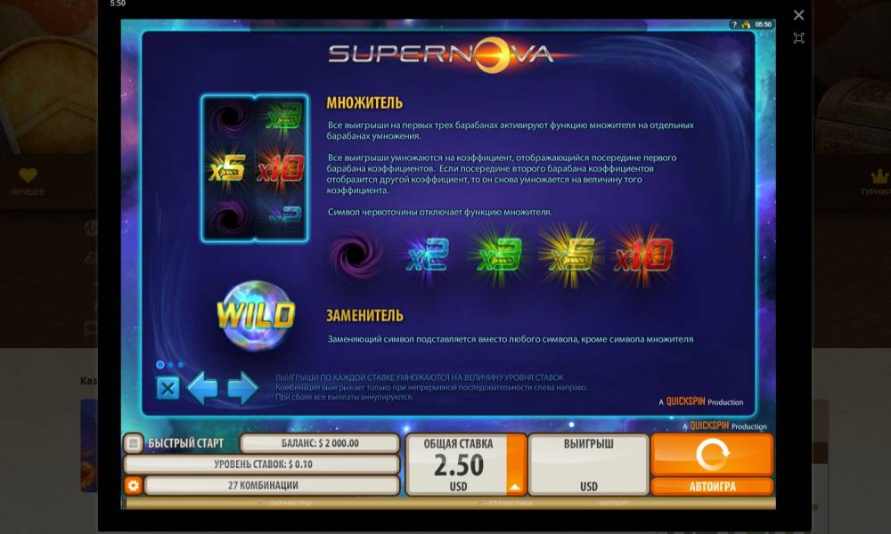 The young and very promising online casino software company Quickspin has introduced a new free slot machine Supernova. The model attracts attention with an unusual interface, original approach to solving standard problems and exciting features.