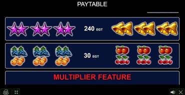 Multiplier Feature. When the entire field is occupied by cherries, peaches, apples or grapes, the player gets a x2 multiplier to all winnings on 27 lines. This does not happen often, but significantly replenishes the bankroll.