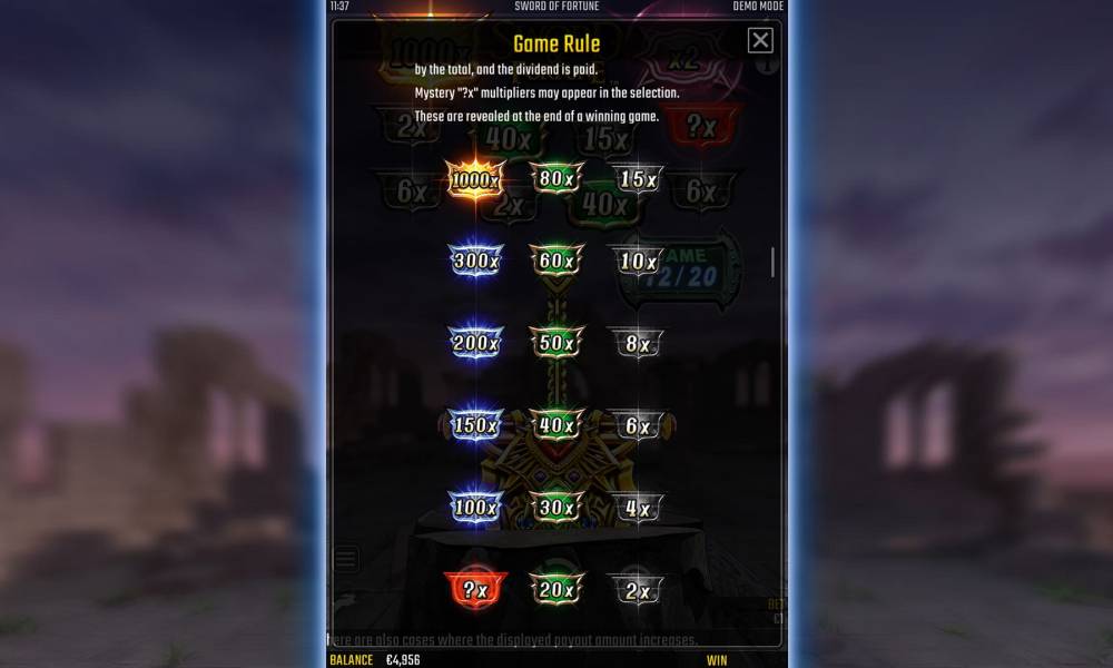 The field presents 10 values of multipliers. These include one large one - x1000, one low or mystery(x?) and 8 random ones from x2 to x300. When the player pulls the sword from the stone, it directs lightning and highlights between 2 and 9 additional multipliers. These are summed up and multiplied by the bet. If there was an x? sign among the Multipliers, it means that the entire amount for a successful round will be multiplied by a random number that will appear in the pink box on the right. This always brings a big profit. The game consists of 20 sets. At the end of each set the multipliers change.