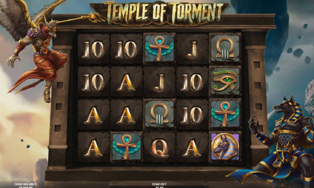 The Temple of Torment slot design embodies the atmosphere of ancient Egypt: massive stone reels are surrounded by a mystical landscape, and grid symbols include mythological artifacts, gods and sacred symbols. The low-paying symbols are the standard card symbols 10, J, Q, K and A.
