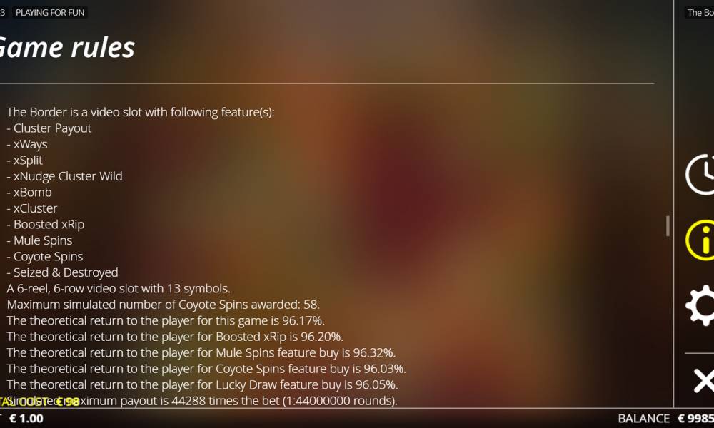 The Border slot machine was released in September 2022 by the provider Nolimit City. The slot with a cluster system and a large maximum prize is still popular with players. He often gives prizes that make you want to play him longer and longer. The design is modest, in dark colors, but with bright symbols on the field. There are favorite players favorite special symbols dividers and those that increase the number of symbols on the field. So it is exciting and interesting to play.