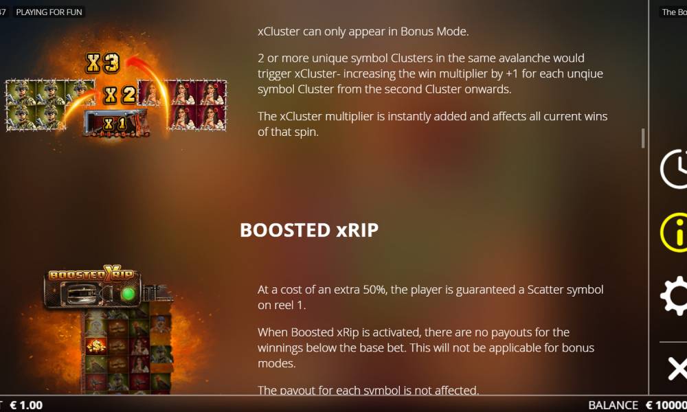 Boosted xRIP. For 50% extra to the bet, the user gets a Scatter symbol on reel 1.