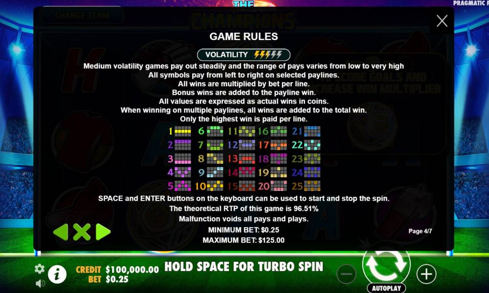 The Champions 5-reel slot machine has twenty-five active lanes. Their number is constant.