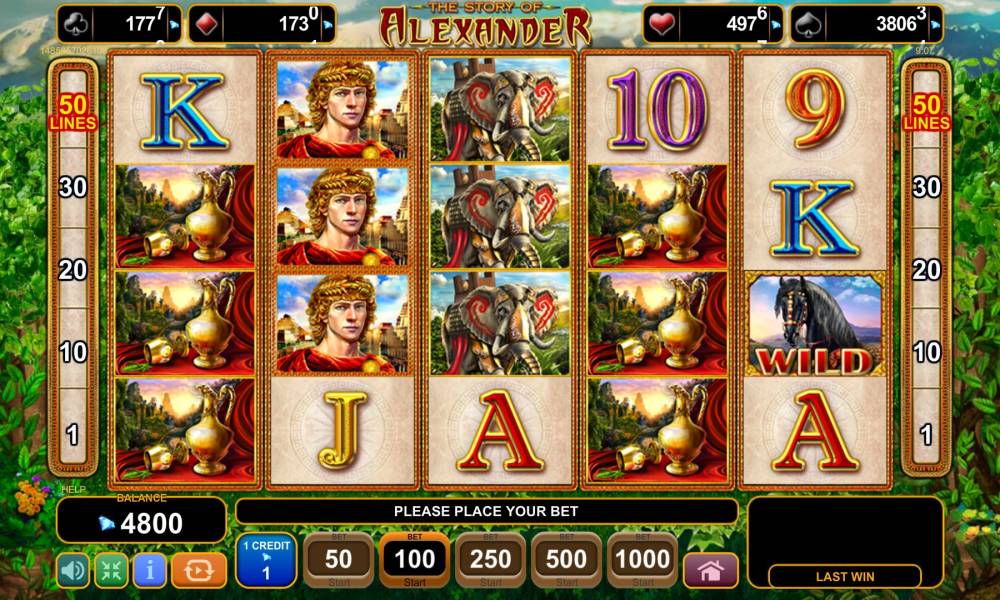 «The Story of Alexander» online video slot has five reels with different symbols. It is possible to use one, ten, twenty, thirty or fifty active lines and place same bets per each of them: one, two, five, ten or twenty coins. Please check out possible coin value directly at the online casino. Symbols are located in 5x4 order at the screen. The gaming options suggested by this model are ordinary symbols, Scatters, Wilds, free spins with bonus options, progressive jackpots and a round of gambling feature. The basic symbols form winning combinations from left to right and only at the active lines. It is necessary to have at least two or three same elements situated next to each other. As usually, only the highest combination at each of the lines is paid. Wins are calculated by the bet per line and a special index, provided by the rules for each of the possible combinations. It varies from x3 to x250 on «The Story of Alexander». These values are multiplied and all credits are summarized in case of numerous combinations formed in result of a round. The gambling feature is optional. If you decide to participate, you would have to guess a color of a face-down card. The rules are clear, so we won’t get into details. The limits can be found at the proper pages of the Help. All exceptions from the general rules and prize features of the slot are described below in the review of «The Story of Alexander».