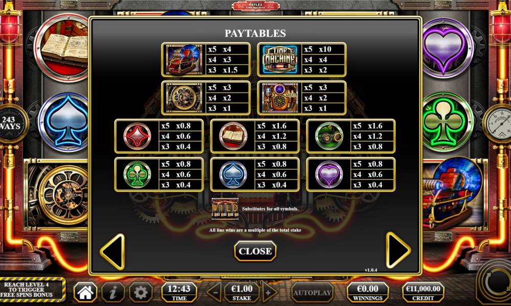 The Time Machine slot from the Yggdrasil Gaming provider has a standard playing field, consisting of 5 reels with 3 symbols. Payouts are made on 243 combinations.
