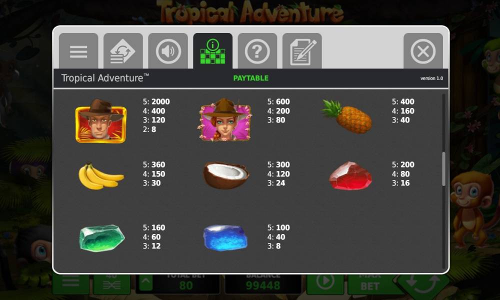 This video slot is available in a browser directly at the website of an online casino. You don't need to download «Tropical Adventure». There is a special version for mobile devices, supported by most of modern smartphones.