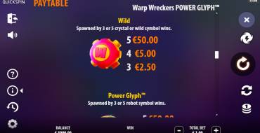 The Warp Wreckers Power Glyph online slot has 5 reels in 5 rows with unlimited paylines. The cascading mechanics are combined with a unique Quickspin development called Power Glyph. Winning lines are formed from 3 or more identical symbols in one row vertically or horizontally. Winning combinations are removed, but no new symbols arrive (except when the Bomber Power-Up is used), the game continues with the symbols that fell out originally. Each time a played line is discarded, the global win multiplier increases by 1, and the Wild symbol (or Power Glyph) remains in place of the discarded symbols. If there are no more winning combinations, the cascades end. Appearance on the reels of 3 or more identical symbols allows you to apply a multiplier to the bet. The multiplier values are shown in the pay table. The maximum multiplication of x50 to the bet promises the fall of 5 Wild or Power Glyph. The bet range is from 0.2 to 100 euros.