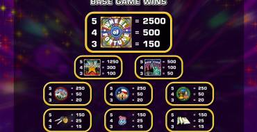 An amount of the payoff is calculated by multiplying the bet per line by the index of formed combination (from x15 to x2500). In case of multiply combinations formed by results of a single spin, all charged credits are summarized.