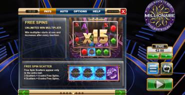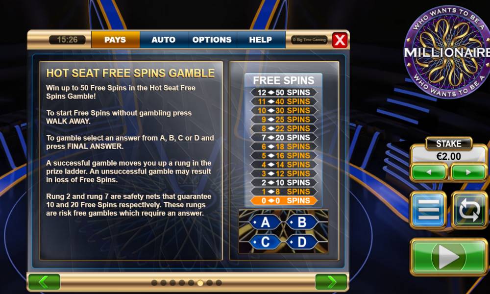 Hot Seat Free Spins Gamble. Before triggering the free spin round, the gambler can take a risk and increase the number of spins. The risk round is realized in the form of the game "Who wants to become a millionaire" with the same design. There are 12 stages with awards - from 8 to 50 FS. There are 4 options for answers: A, B, C, D. The gambler needs to choose 1 of the options. If his answer coincides with a randomly selected option - he goes up a step higher. If the answer does not match - the risk round is lost. There are 2 safe points in the risk-round - steps 2 and 7 (10 and 20 FS). If you reach them, this number of free spins will be triggered if the gambler risks further and loses. The risk round can be canceled and free spins can be triggered as soon as 3 or 4 Scatters appear - to do this, press the Walk Away button.