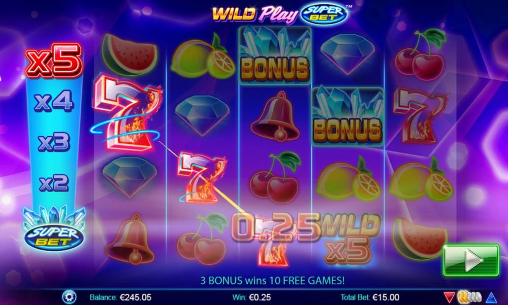 «Wild Play Super Bet» offers basic symbols, Wilds, Scatters and free spins under special conditions.