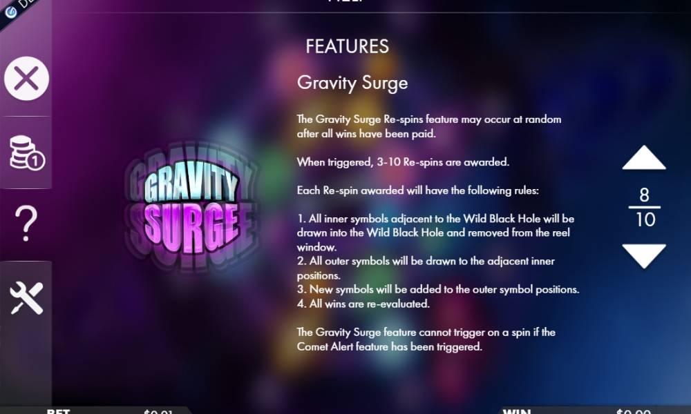 • Gravity Surge – this feature can also begin randomly during any regular spin. The gambler gets a right for three-ten respins. The casino pays his bet. With every new spin inside this feature, symbols at the screen are falling into the black hole and new icons show at empty cells.