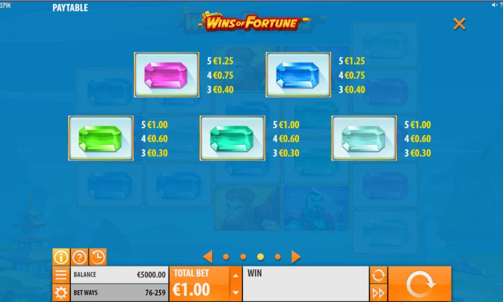 The gaming symbols, imaged at the screen of «Wins of Fortune» video slot, are Sun Wukong, Zhu Bajie and two other characters of «Journey to the West» novel. Moreover, five gems are also imaged at the reels. They might drop in vertical stacks at the reels.