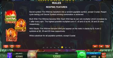 • Fire Witch Respins – one free respin on the casino’s expense. Before the beginning of the respin, one of three options is activated: secret symbols, numerous Wilds or stacks of Wilds. Their detailed description can be found on the Help. Wilds and secret symbols remain at the screen till the end of this round.