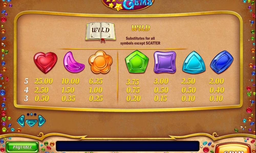 There are seven basic symbols in «Wizard of Gems» video slot. They are images of colorful candies. There are also two special elements, such as Wild (an ancient book) and Scatter (golden stars). Please read about their functions below:
