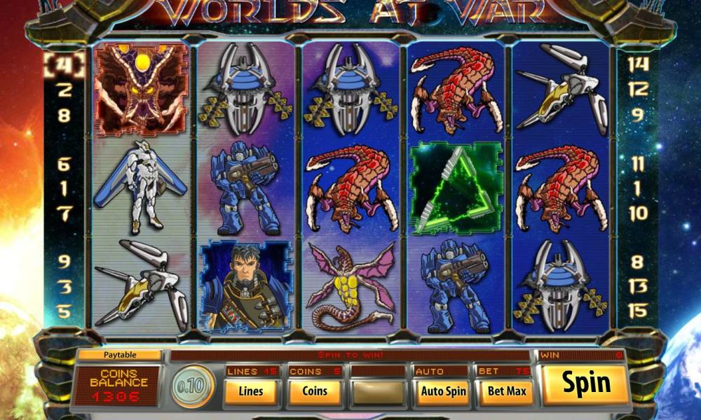 At the screen of Worlds at War video slot you can see images of two feuding planets, their soldiers and different kinds of military technics and armor.