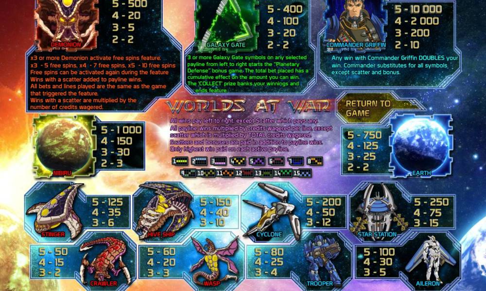 Worlds at War is a free online slot machine with five reels and fifteen pay lines. The scheme of their location can be found in the index table.