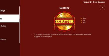 Online slot Year of the Rabbit works with classic playing field, consisting of 5 reels and 243 paylines, which can fall winning combinations. In order to get winnings, you need to collect the same symbols on several neighboring reels, starting with the first reel. There are several symbols, including the Wild symbols, which substitutes for other symbols and the Scatter symbol, which activates the bonus features. Bets per spin can be placed from 0.25 to 125 coins, allowing you to to choose the right amount for different types of players.